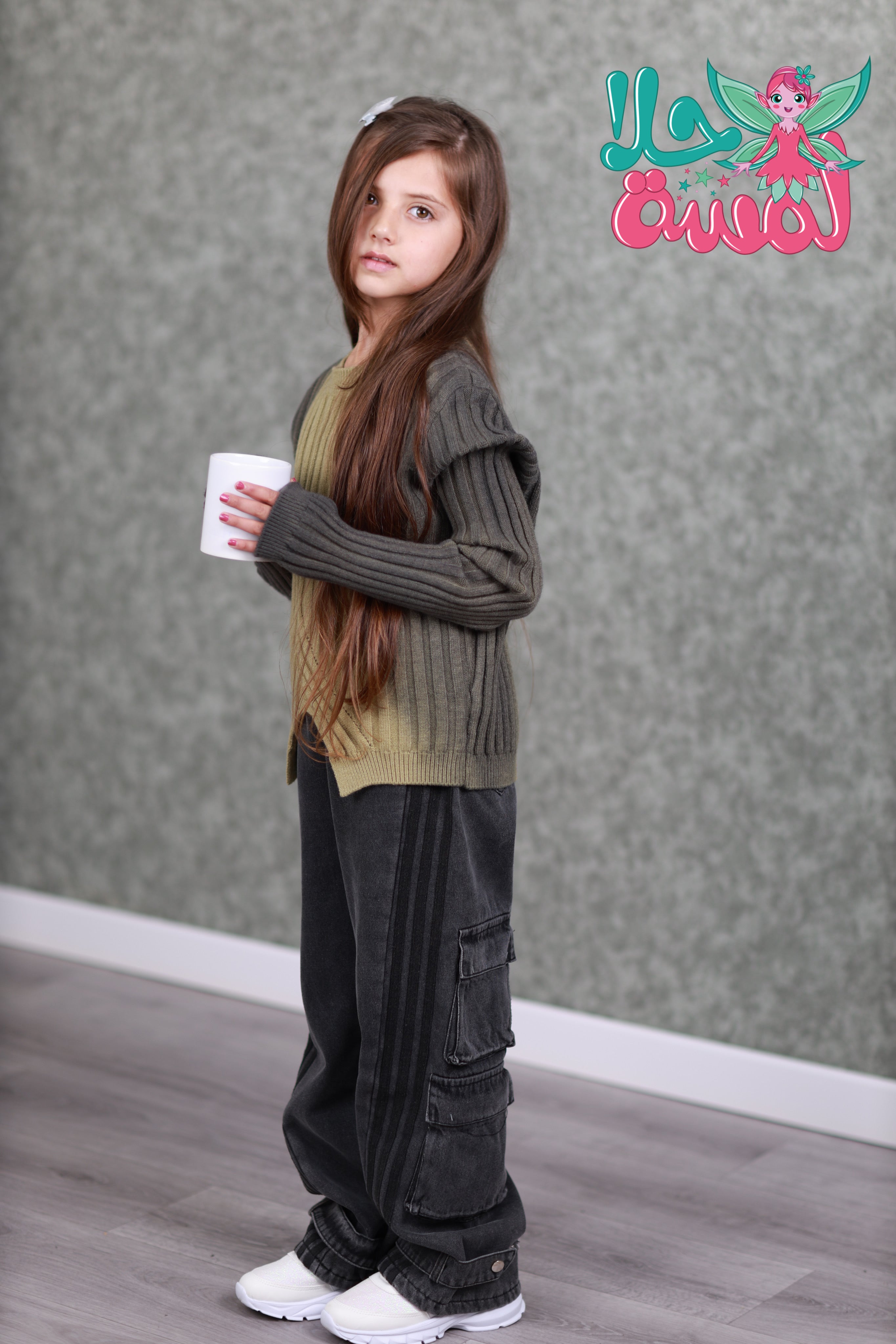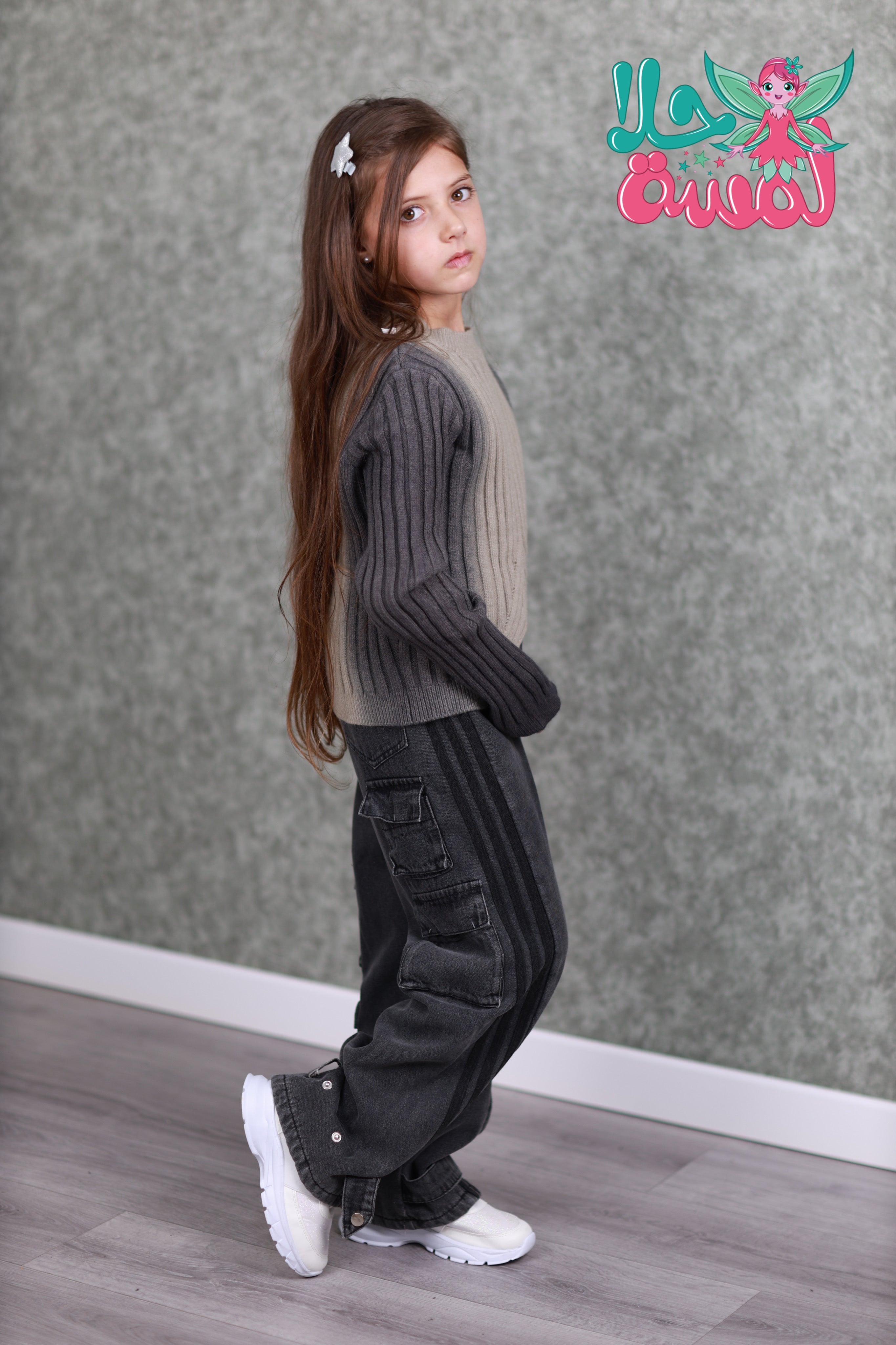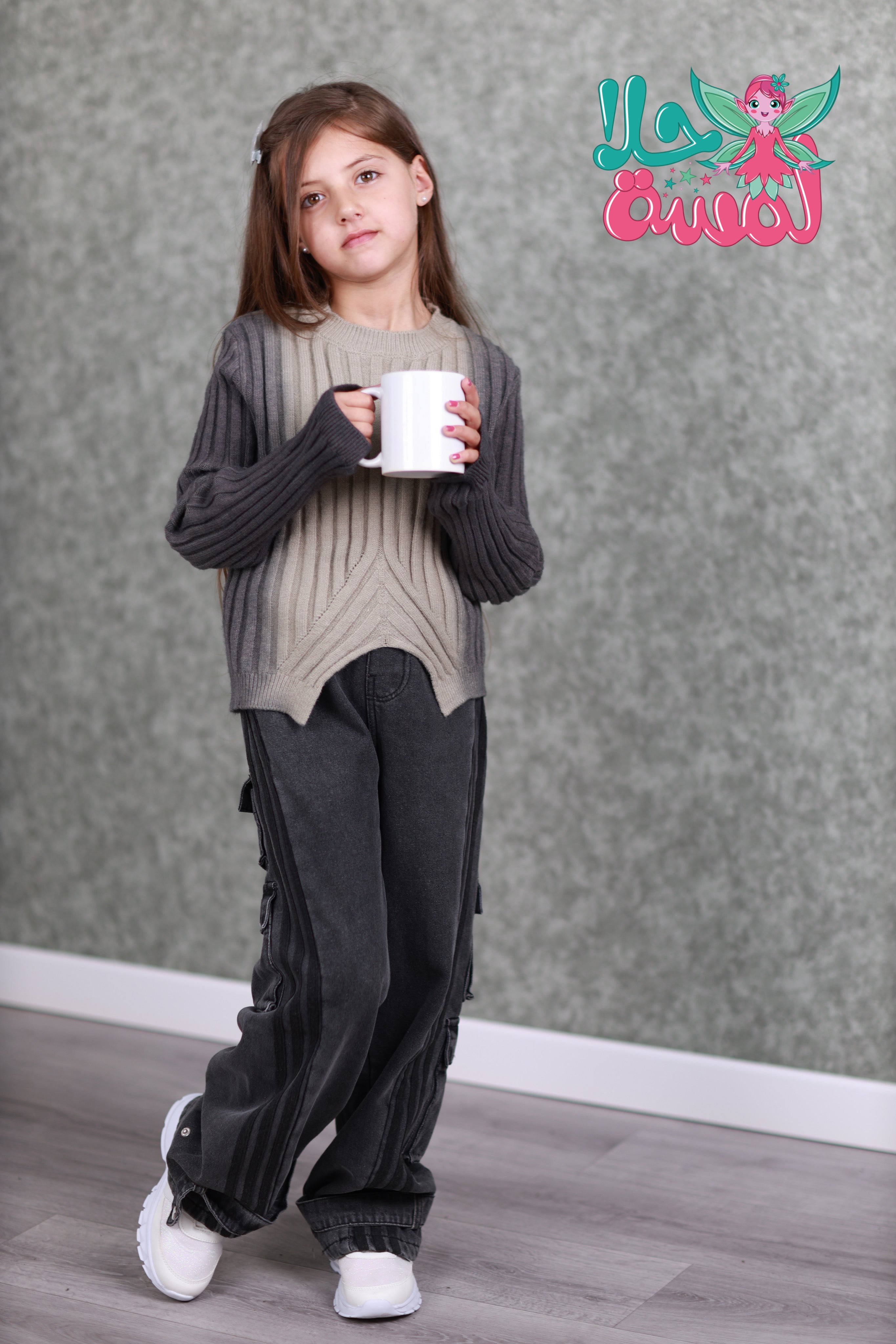 طقم بناتي شتوي قطعتين ( بلوزة صوف + بنطلون جينز مبطن فرو )