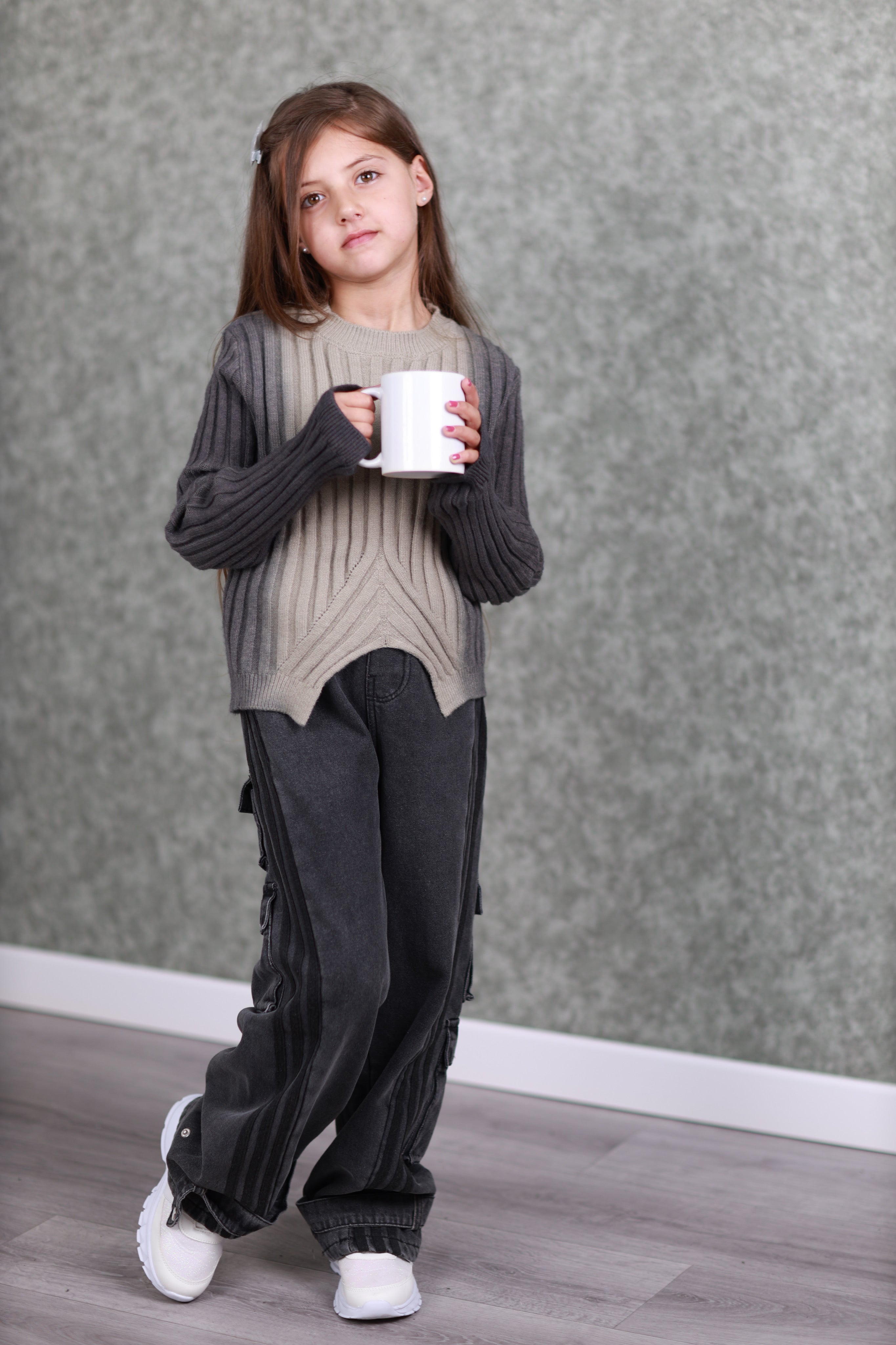 RM171223-22 طقم بناتي شتوي قطعتين ( بلوزة صوف + بنطلون جينز مبطن فرو )