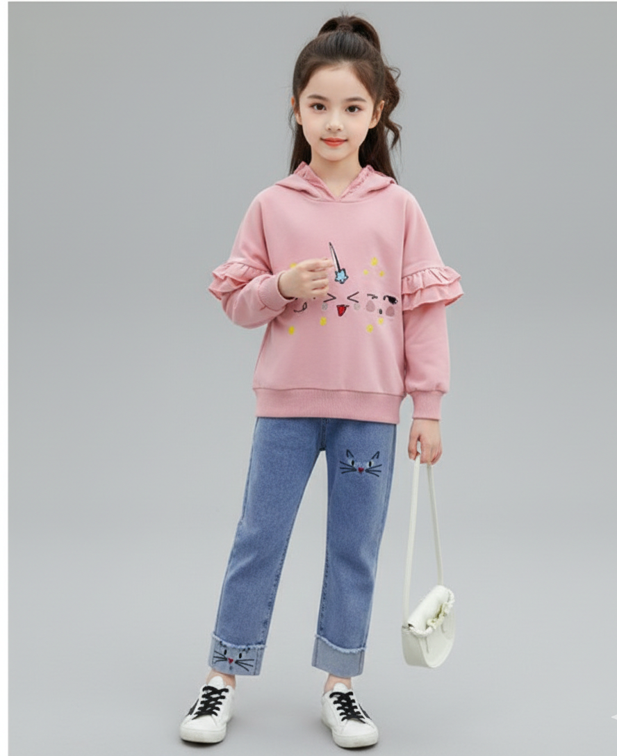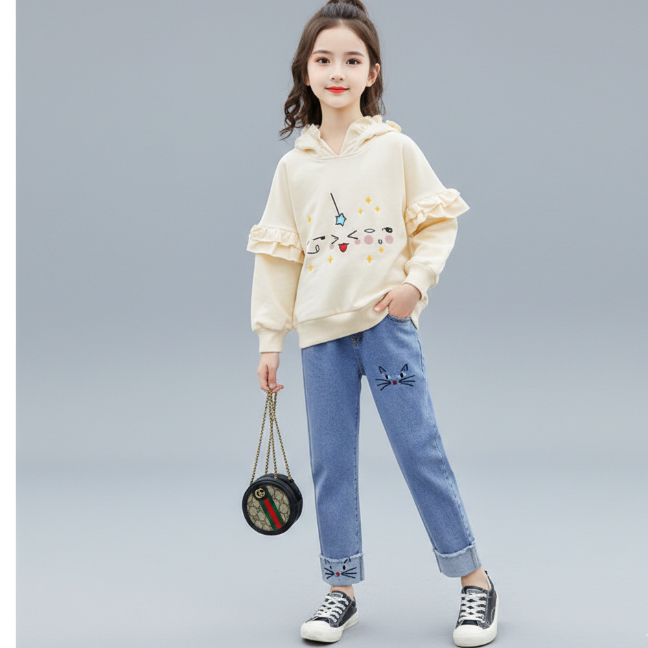 طقم بناتي قطعتين ( بلوزة قطنية + بنطلون جينز)