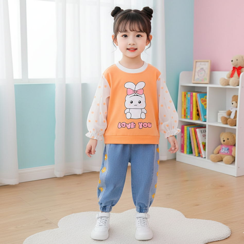 طقم ارنوب خريفي ربيعي قطعتين ( بلوزة + بنطلون مزين بالشفون)