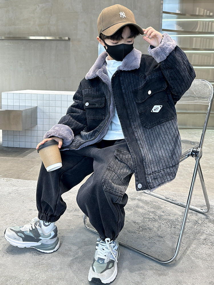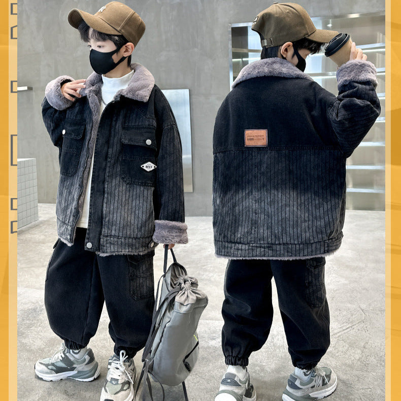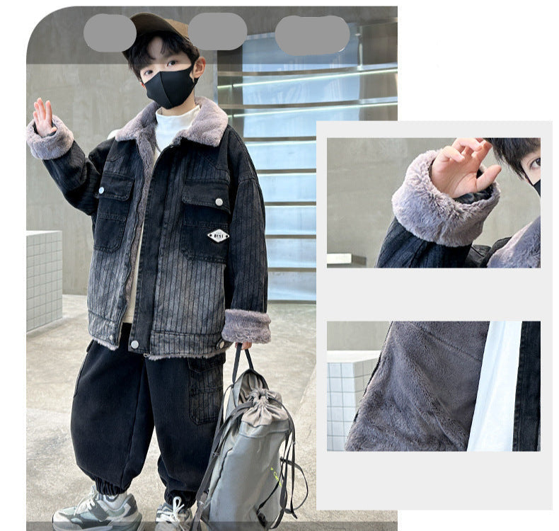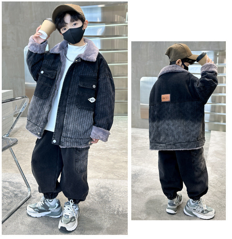 طقم شتوي ولادي مناسب للتلج وللبرد الشديد مبطن فرو بالكامل قطعتين ( جكيت+ بنطلون)
